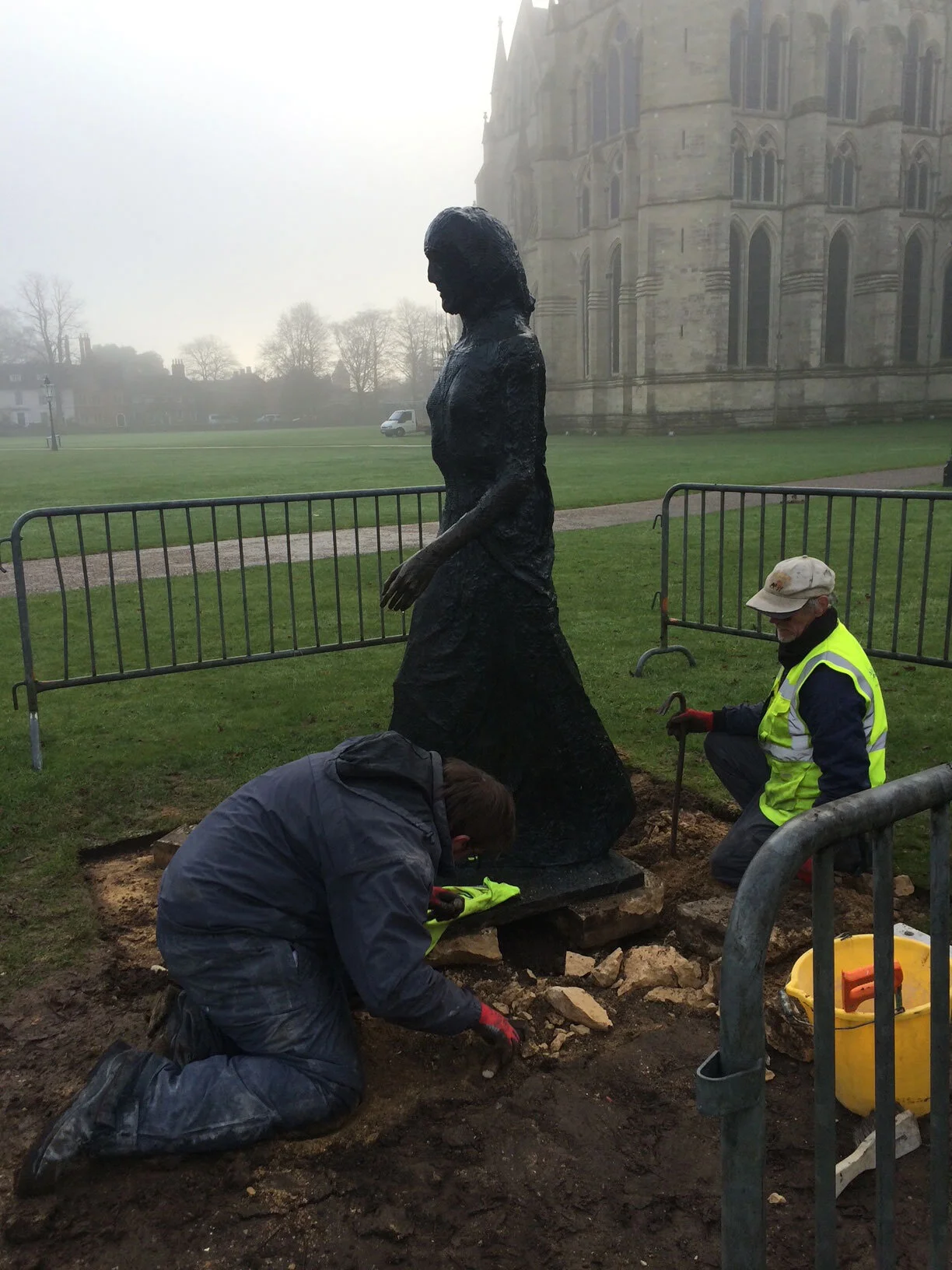 Walking Madonna by Elisabeth Frink. Removing of cement slabs all works and installation by Salisbury cathedral works department.
